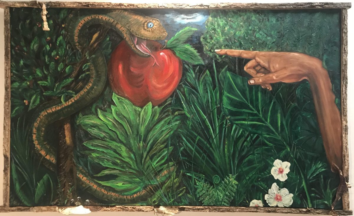 by Dr. Phoebe GodfreyArtist Statement: This is an original painting, although the hand is a copy of the angel’s in Da Vinci’s Virgin and the Rocks (1494-50). The painting explores my idea that if Eve never ate the apple and ‘we never fell’ then we must still be in Paradise and, therefore, what our culture is doing to the Planet […]